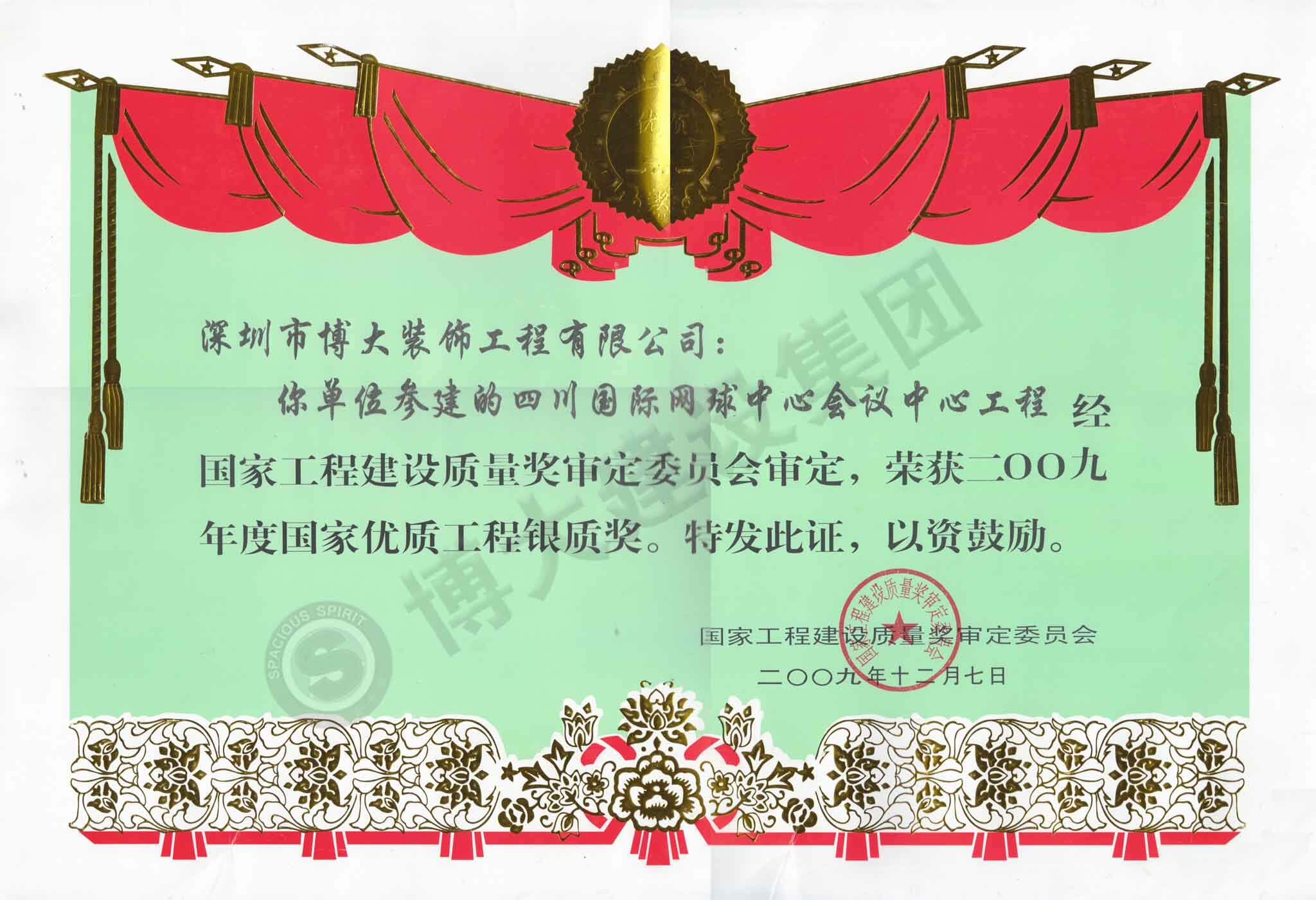 國家年度優(yōu)質(zhì)工程銀質(zhì)獎(jiǎng)(四川國際網(wǎng)球中心會(huì)議中心工程)
