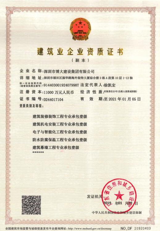 2019年1月9日,中國建筑工程裝飾頒獎大會在北京隆重舉行,根據中國建筑裝飾行業綜合數據統計,博大建設集團憑借綜合實力,以奮進姿態挺進行業全國前十,其中,裝飾類排名全國第九、幕墻類排名全國第九、設計類排名全國第十。
