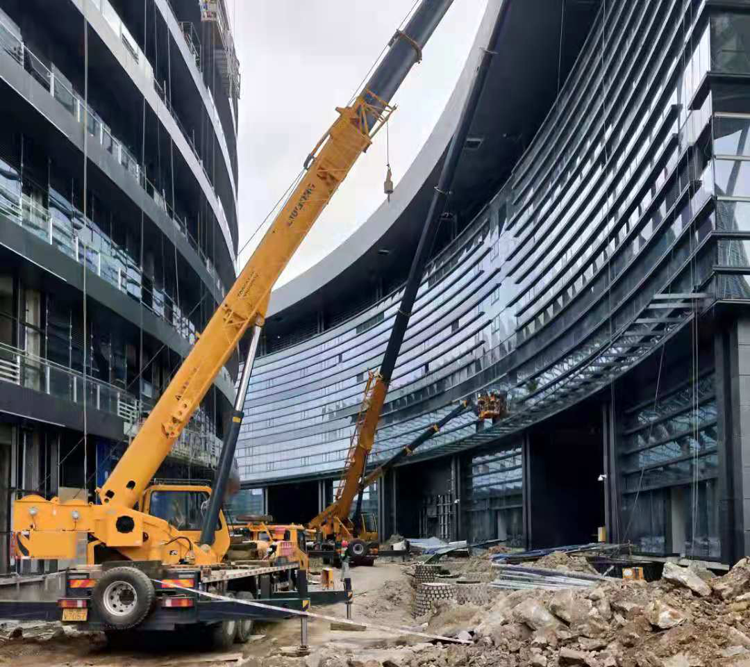 項(xiàng)目東側(cè)建筑高度為31米的大型球型網(wǎng)架結(jié)構(gòu)鋁板安裝,施工難度大、危險(xiǎn)系數(shù)高;